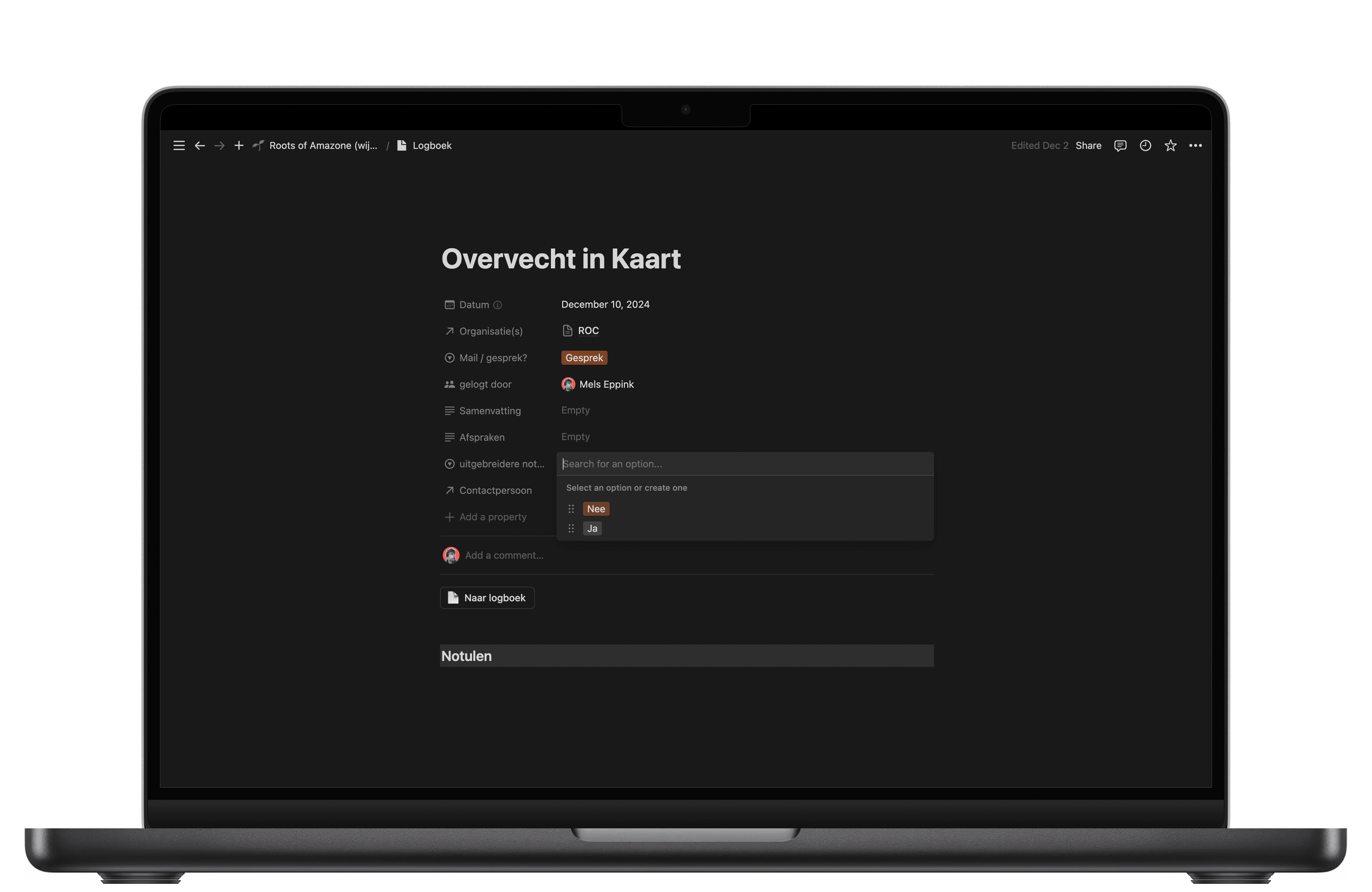 Vanaf deze pagina worden alle notulen toegevoegd aan het logboek. Hierin wordt overzichtelijk vastgelegd welke collega welke acties heeft uitgevoerd, op welk moment, en wat de belangrijkste punten uit het gesprek waren.